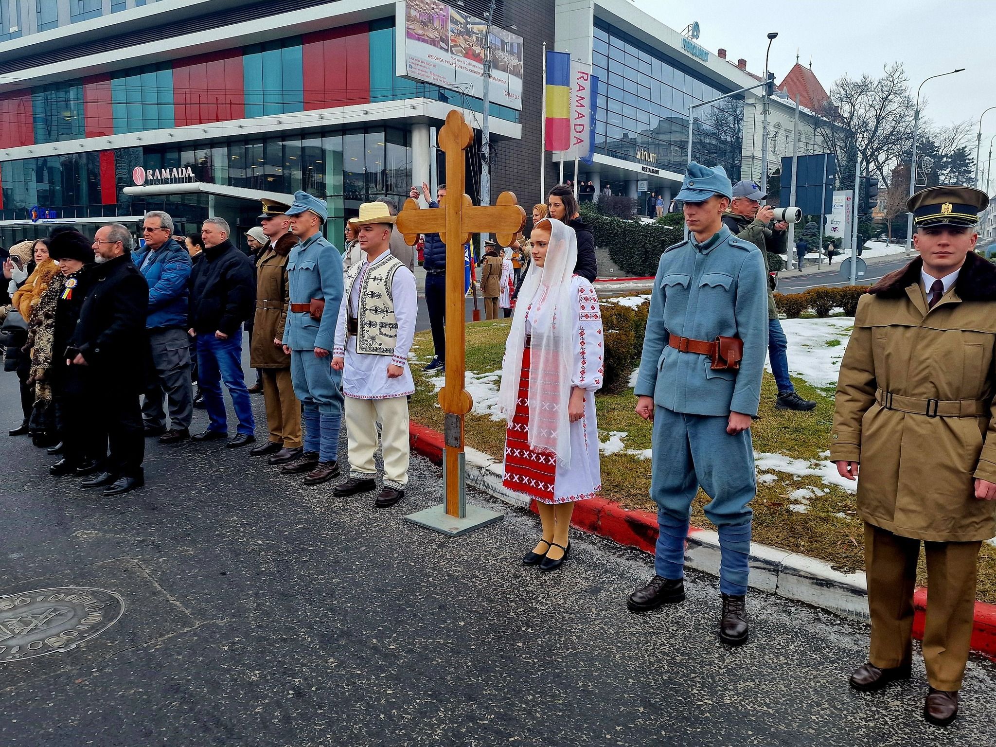 Crucea de lemn înaltă de mai bine de doi metri a fost pusă vineri dimineața în sensul giratoriu din Sibiu, în mijlocul celor care au luat parte la Hora Unirii.